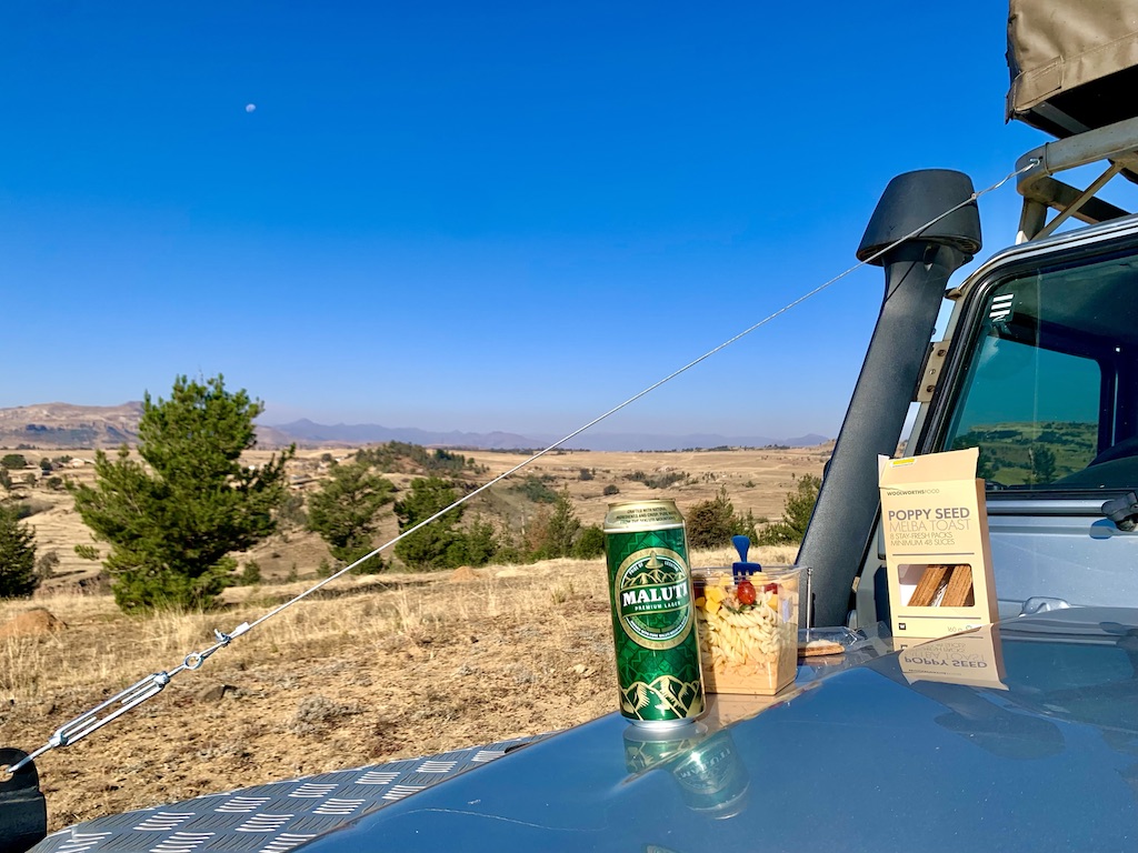 Je vis arriver, en guise de réponse avec mon poulet-frites-salade, six grandes canettes de Maluti bien fraîches, la bière locale. Plus qu’il n’en fallait pour oublier le froid de canard qui régnait dans toutes les pièces de la maison (il faisait -4 degrés dehors et les maisons ne sont en général pas chauffées ni bien isolées) et fêter en tête à tête avec moi-même mon arrivée dans ce nouveau pays d’accueil, particulièrement accueillant !