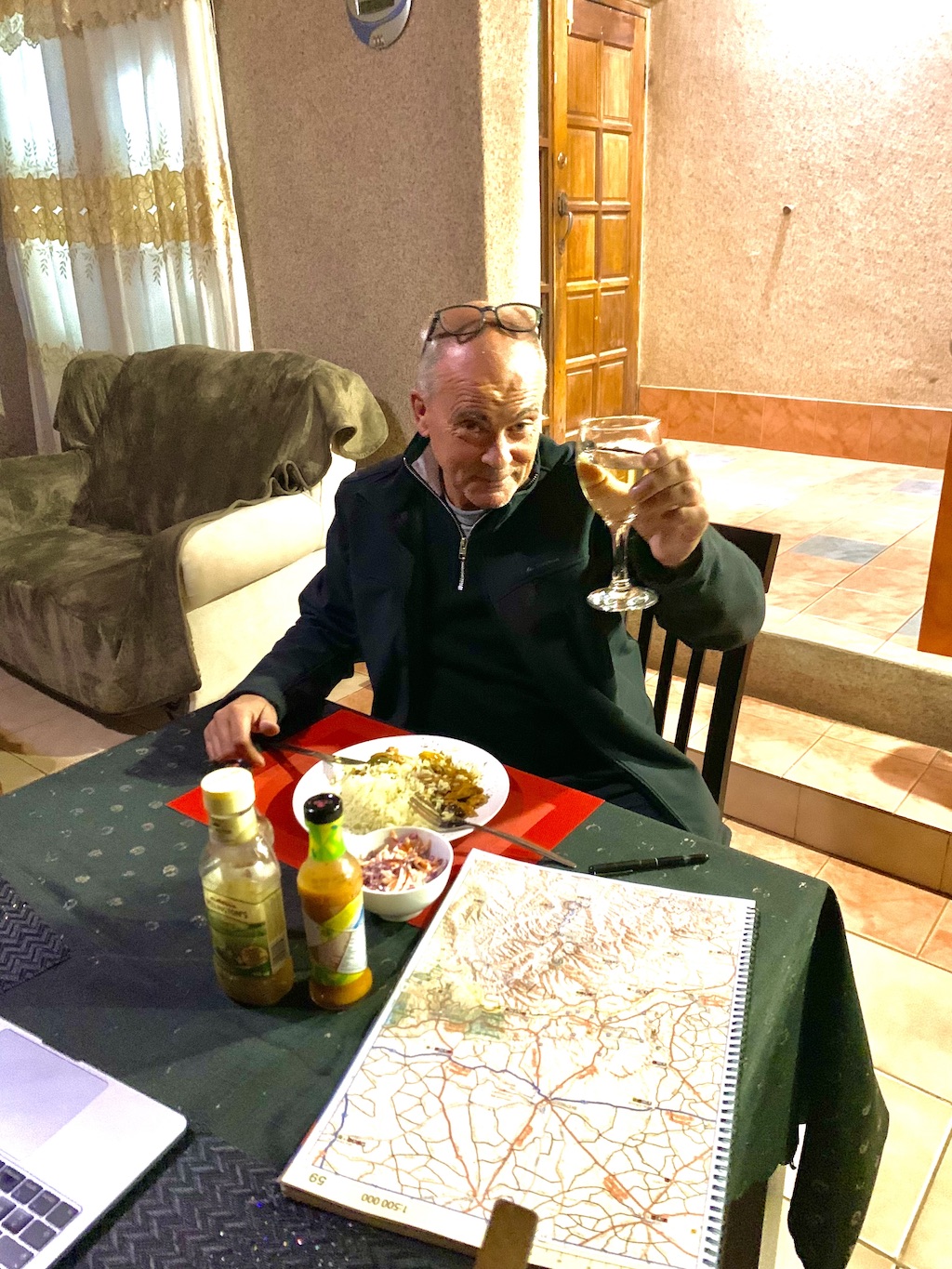 J’étais bien évidemment le seul client de l’établissement. J’eus le privilège de choisir ma chambre. Je pris celle qui me parut la plus cosy, si cet adjectif méritât de s’appliquer aux talents décoratifs très personnels de Christina, mais surtout l’une des plus petites car mon cerveau évalua rapidement le froid polaire qu’il faisait dans toute la maison et le peu de vaillance que semblait avoir le maigre radiateur électrique qu’on me présenta comme la solution miracle à mes craintes exprimées de mort par congélation. Bien qu’aucun diner n’eut été prévu dans les prestations du lieu, Christina céda à ma demande et me concocta un excellent poulet-frites, peu créatif mais dont j’aurais vanté sincèrement les mérites à tous les guides gastronomiques de la Terre, tant j’avais l’estomac dans les talons !