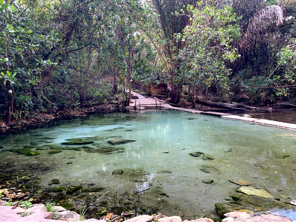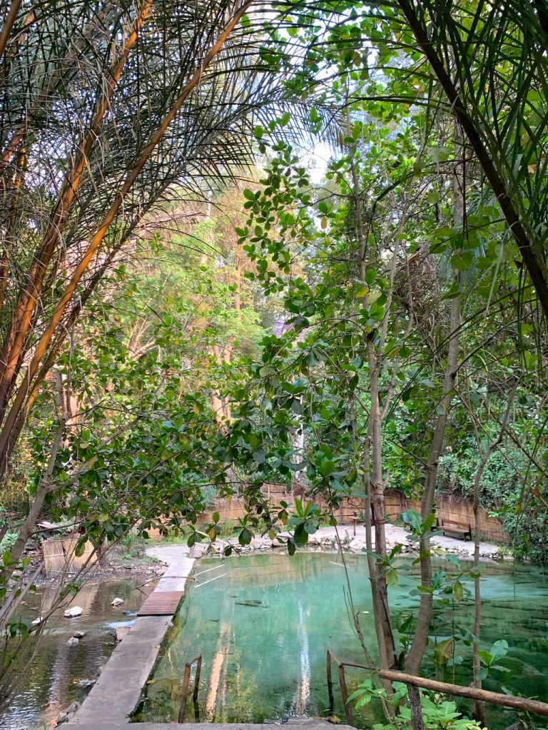 Ici, toute la nourriture est produite localement, dans le potager, le verger, dans des jardins luxuriants qui bordent la rivière généreuse en irrigation. Le lieu est tellement extraordinaire que l’on peut s’y baigner dans des piscines naturelles, de couleur vertes et cristallines, alimentées par des sources chaudes, créant une sorte de lagon d’eau douce, à 40 degrés.