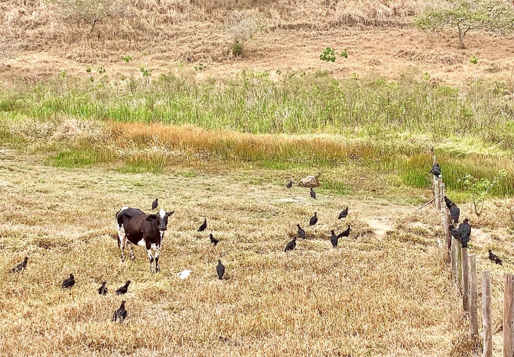 Dans un champ, le regard éperdu et triste d’une vache qui veille le fœtus de son bébé mort né. Cette petite tache blanche qui se dessèche au soleil, devant elle. Elle sait que si elle s’éloigne, si elle renonce, la horde d’une trentaine de corbeaux aux allures de vautours, dans leur habit de croque-mort, se jettera sur sa dépouille et mettra en pièces ce qui fut son espoir.
