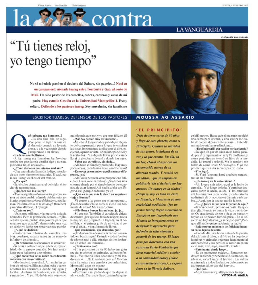 En février 2007, la quatrième de couverture du journal La Vanguardia présentait une interview réalisée par Víctor Amela avec un Touareg, un habitant nomade du désert du Sahara. Les « hommes en bleu », comme on les appelle, sont présents en Algérie, en Libye, au Nigeria, au Mali, en Mauritanie et au Burkina Faso. La phrase de Moussa Ag Assarid, l’interviewé, continue de parcourir la planète comme un message, peut-être comme une invitation à la vraie vie : « Tu as l’heure, j’ai le temps ».