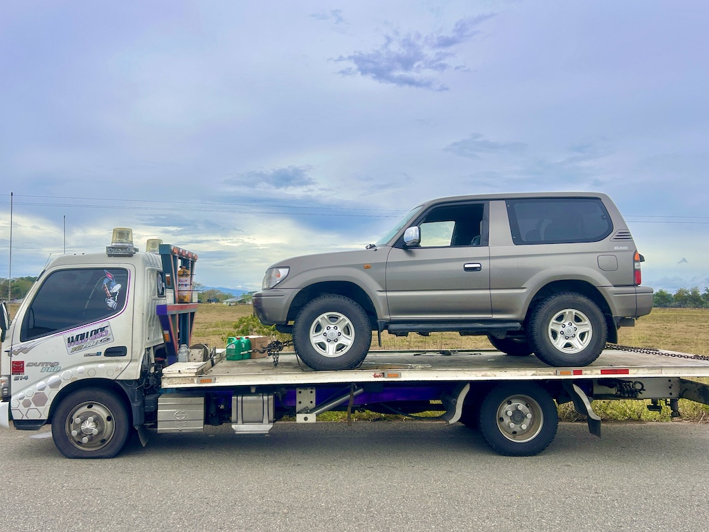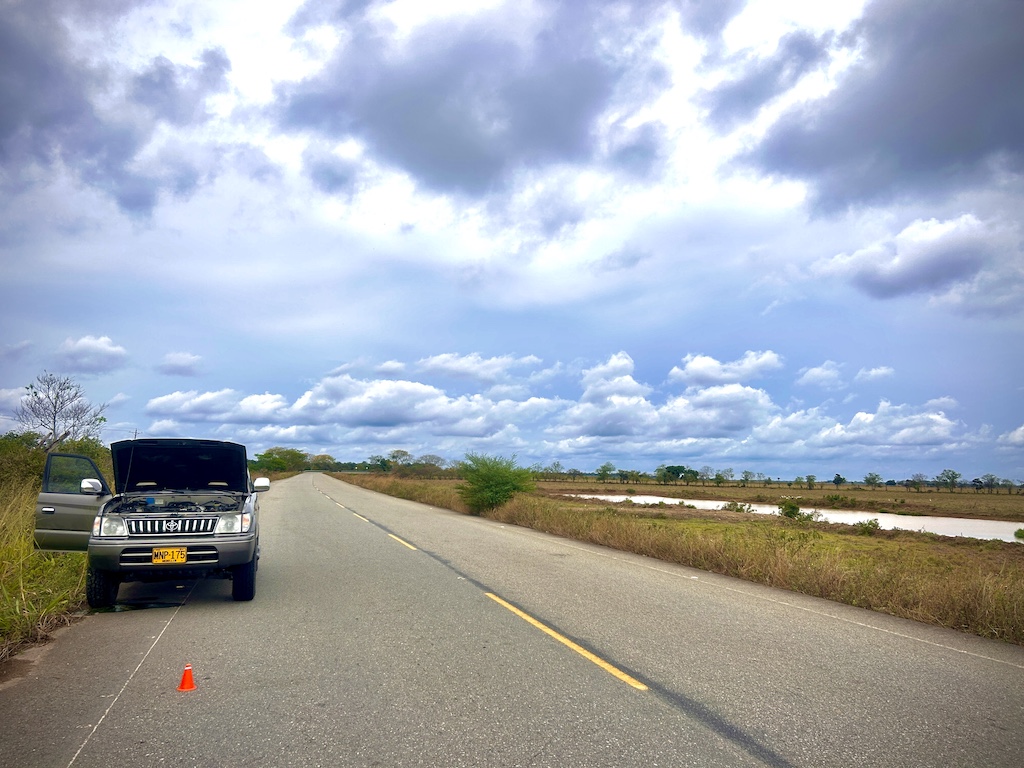 Soudain, au bout de l’immense ligne droite, dans le miroitement de la chaleur de ce début d’après-midi, en ces terres où même les arbres semblent chercher un refuge, le dessin d’une dépanneuse se dessina, devenant de plus en plus précis. Nous n’allions plus tarder à retrouver la civilisation, du réseau téléphonique et pouvoir concocter un plan B afin de rejoindre Bogotá, et pour qu’Hélène puisse s’envoler le surlendemain vers Paris. À ce stade, j’avais encore espoir que l’on puisse trouver un garage à Yopal, que la panne soit bénigne et que l’on puisse repartir dès le demain. L’optimisme doit être solidement ancré dans mon ADN.