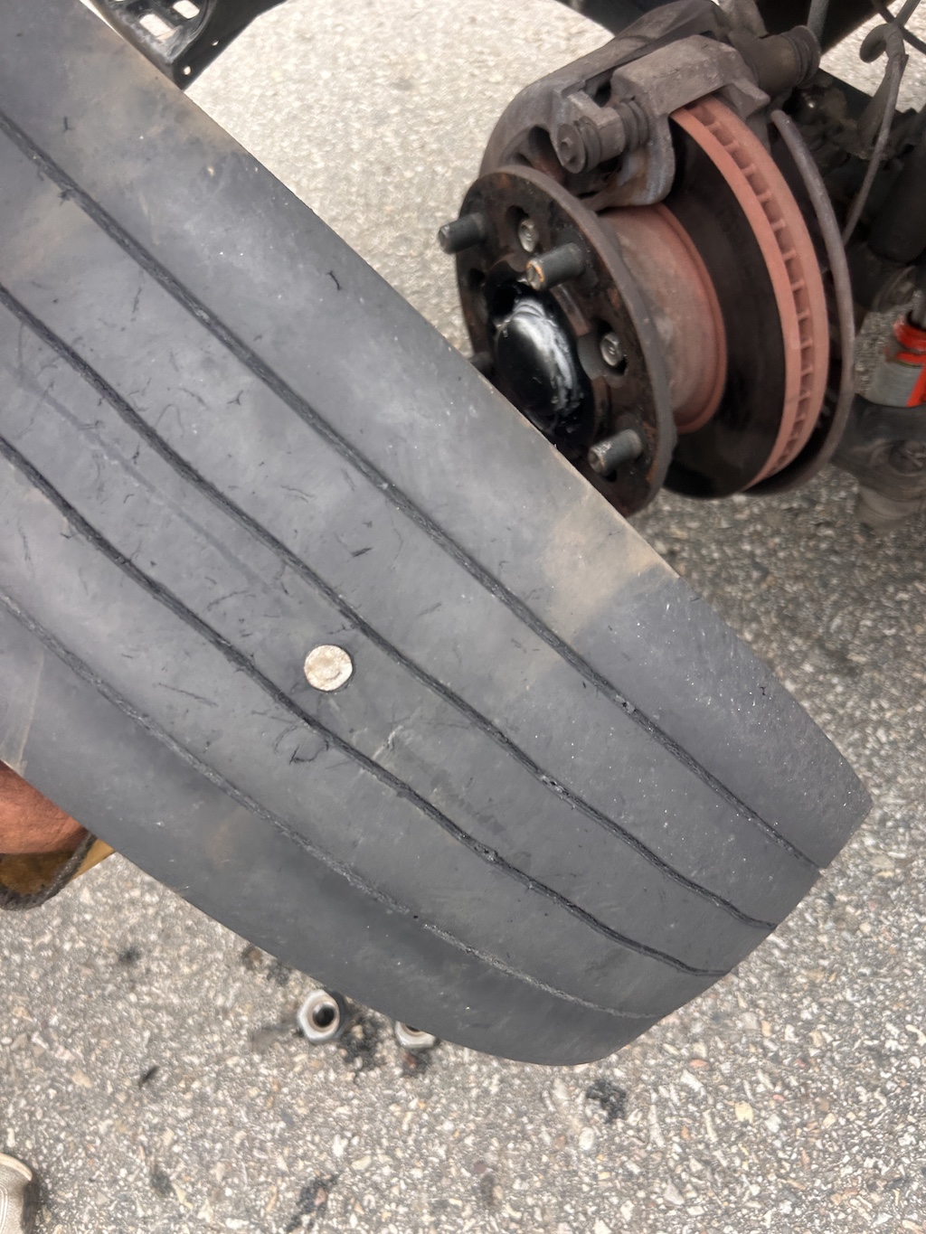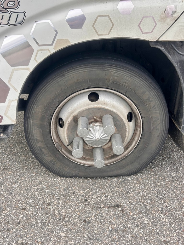 Au moment où nous nous apprêtions à grimper dans le camion, il me regarda avec un air de chien battu et me montra le pneu avant gauche de la dépanneuse. Totalement à plat.