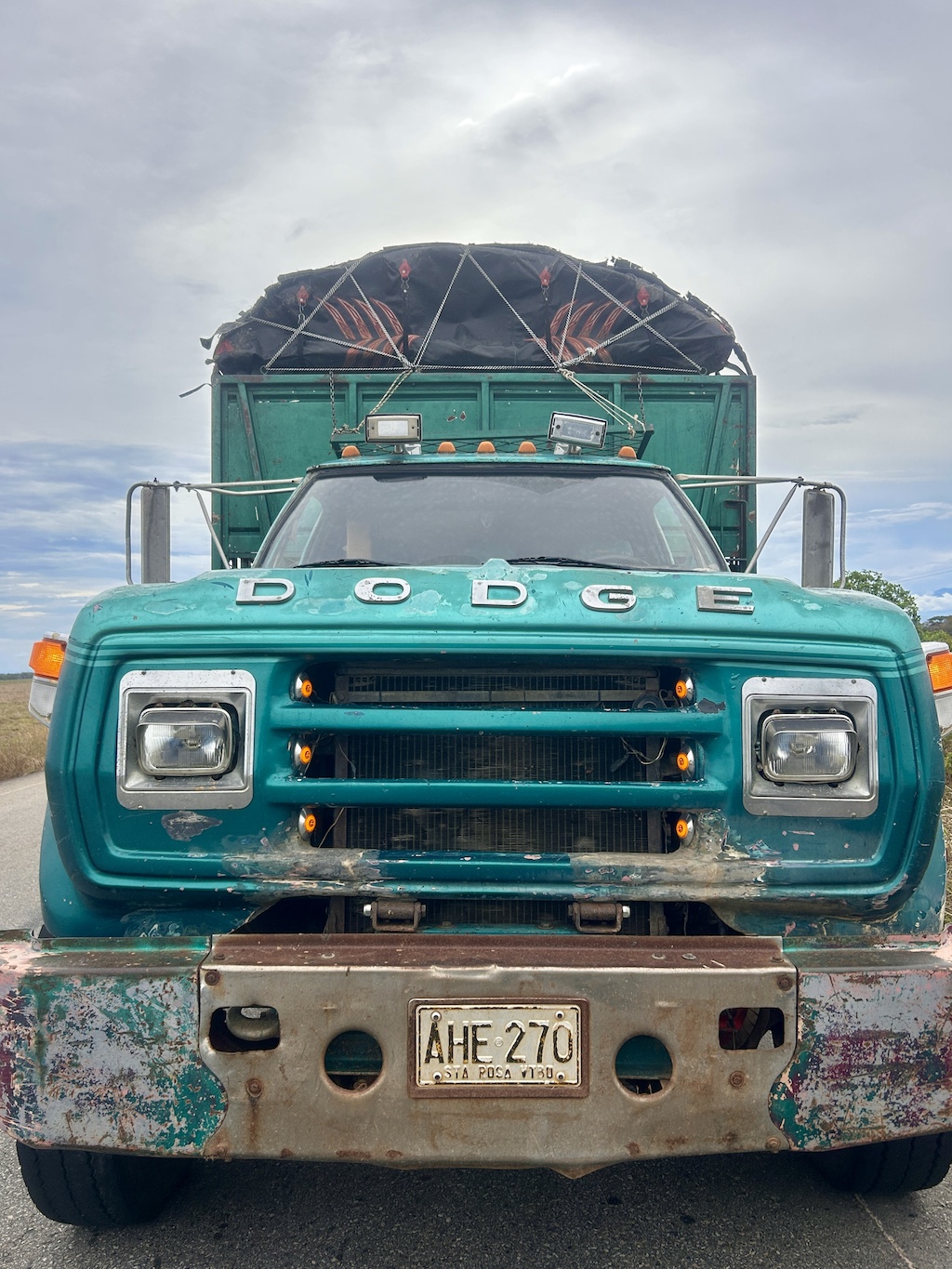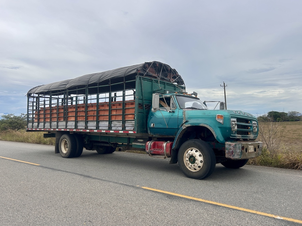 C’était sans compter l’arrivée d’Evelio, un débonnaire camionneur de 58 ans, au volant de son camion Dodge visiblement du même âge, et deux millions de km parcourus pour trimballer toutes les sortes de marchandises possibles aux quatre coins de la Colombie. Ce dernier se traînait à une allure de sénateur, en précédant un nuage de fumée noire qui n’avait jamais dû entendre parler de la préservation de l’environnement, avec l’air de ces véhicules d’un autre âge qui en ont tant vu, et qui savent que dans la vie, il n’y a pas d’urgence, il n’y a que des gens pressés.