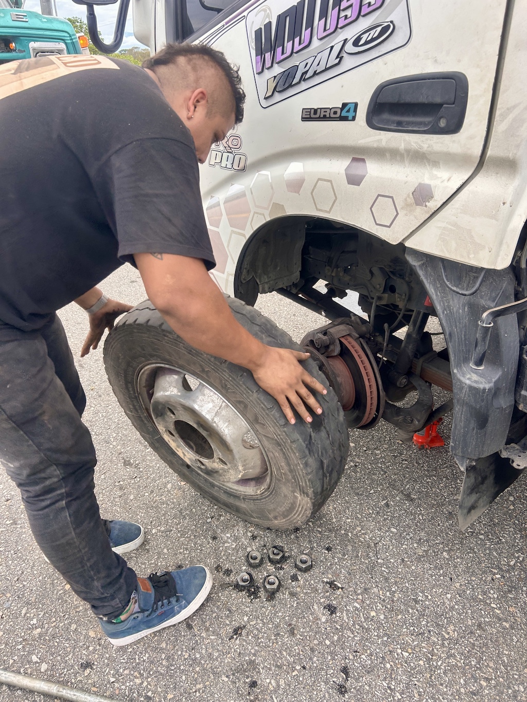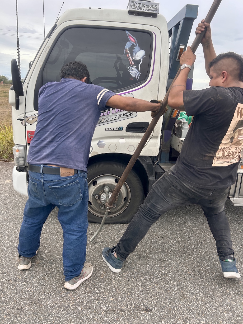 Nous lui fîmes de grands signes et Cristian alla lui expliquer nos soucis. Il gara son camion et disparu derrière pour revenir armé d’une longue barre de fer, creuse en son centre. Cristian l’enfonça sur la clé de roue pour prolonger son effet de levier. Il commença à forcer comme nous l’avions fait tous les deux, sans résultat. Mais Evelio le stoppa net dans ses efforts, nous expliquant que sur ce type de camion les boulons se démontaient en tournant dans le sens des aiguilles d’une montre. Il nous en fit la démonstration, qui me parut hallucinante mais pour le moins implacable d’efficacité et de rapidité. En cinq minute à peine, les cinq boulons étaient retirés, alors que depuis 20 mn, Cristian et son apprenti français peu dégourdi dépensaient sans le savoir, une énergie folle – en croyant bien faire – mais en réalité ne faisaient que serrer encore plus fortement les écrous. Comme quoi, on en apprend à tout âge.
